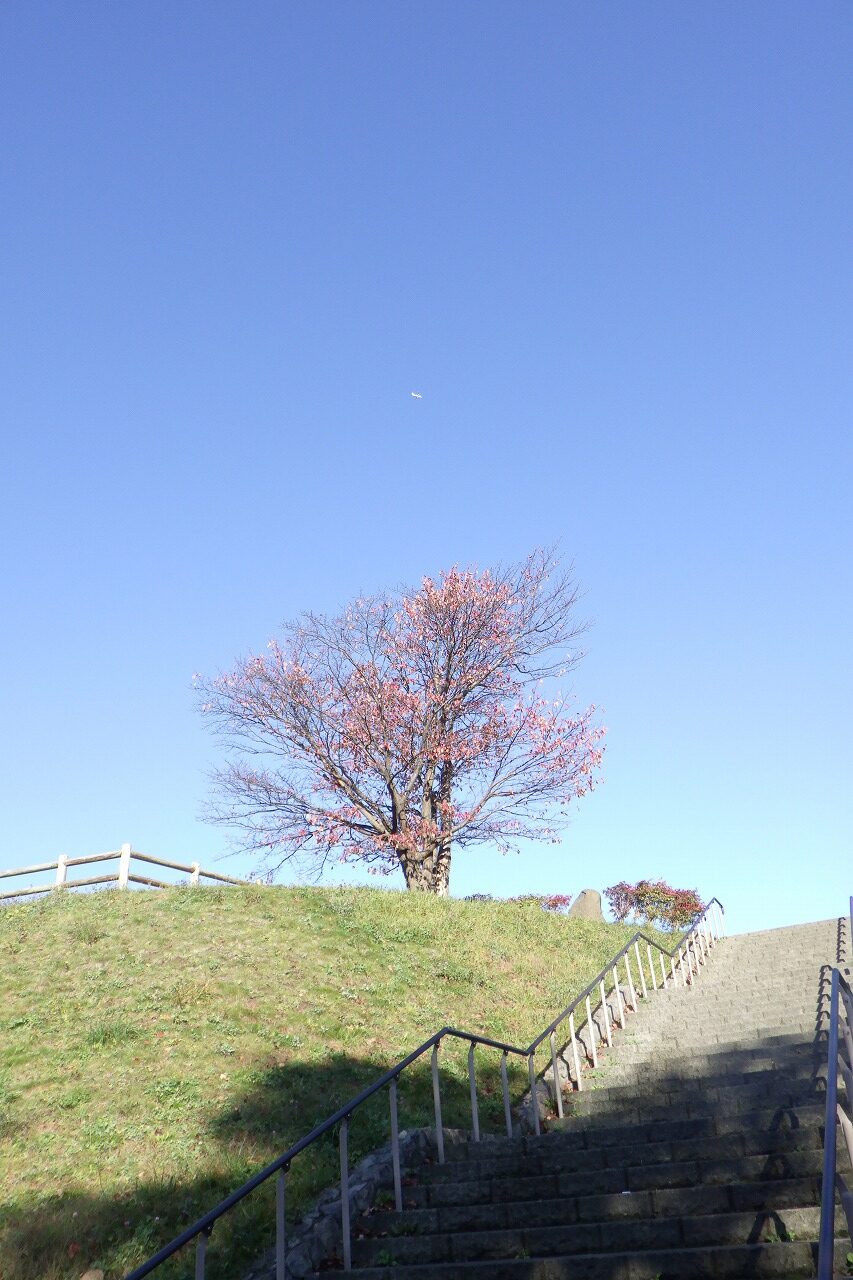 展望台一本桜、左手後方に見える第1駐車場西側斜面の木々の色づきもきれいです。