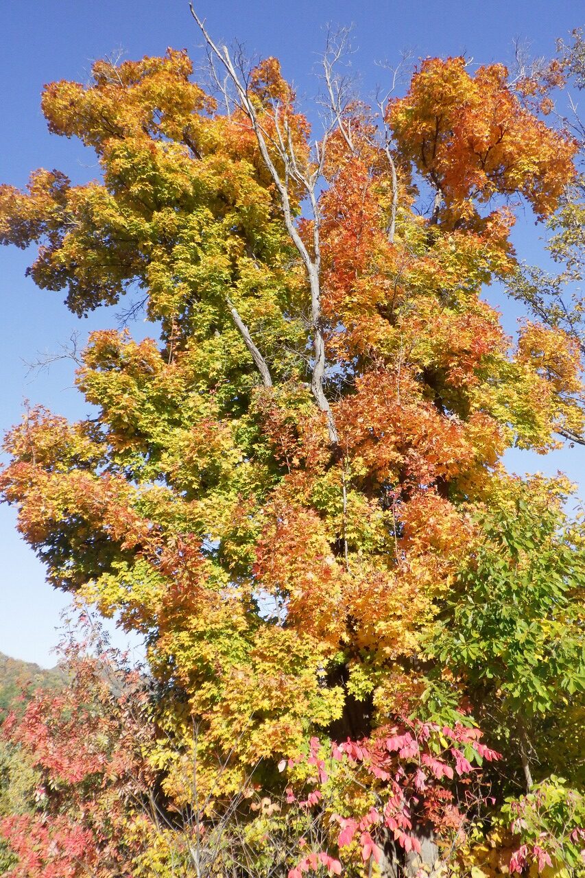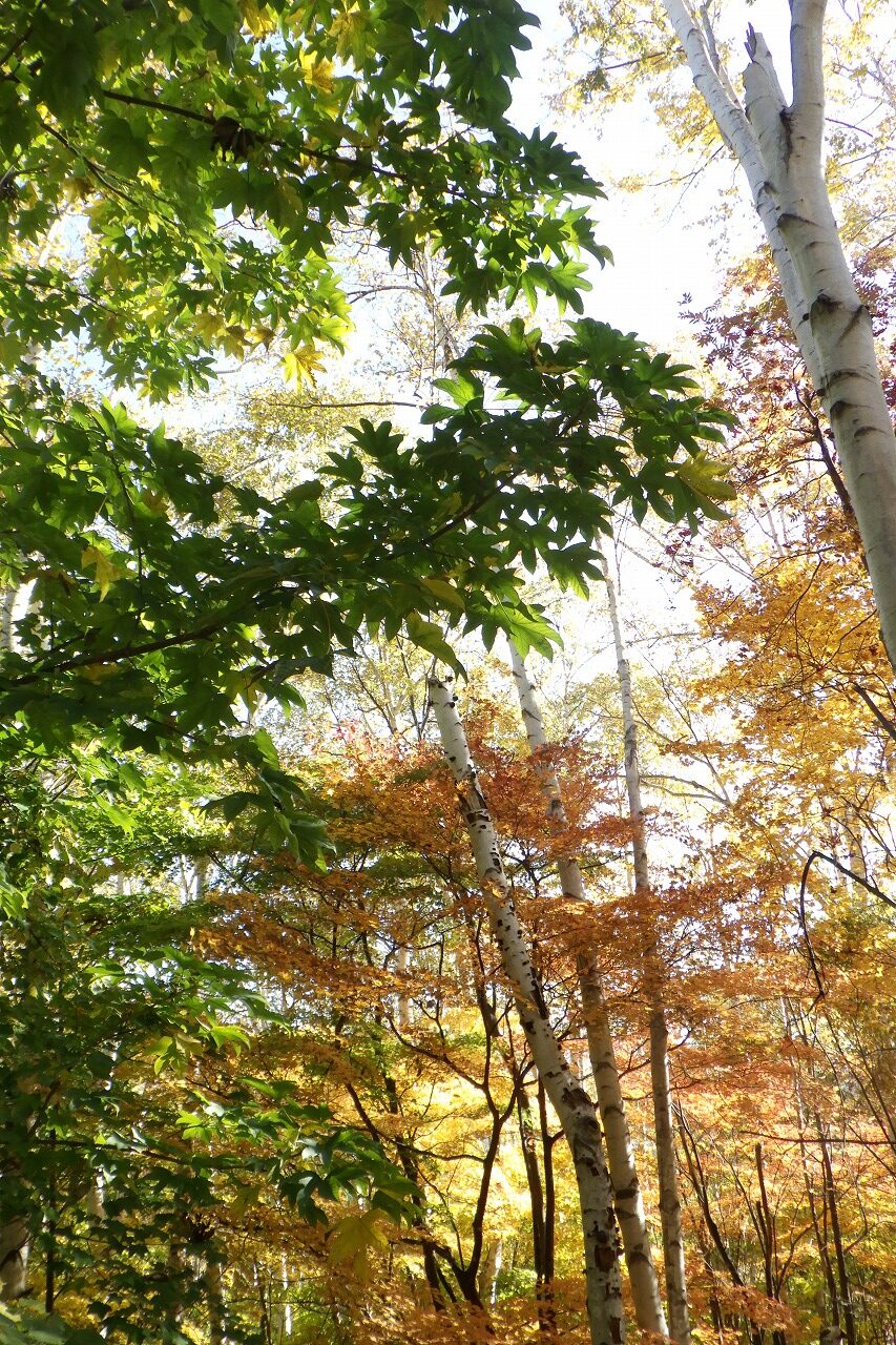 この写真、ハリギリの葉はまだ緑色、一方でヤマモミジは真っ赤、ほかに黄色い葉も見えますが、これはこれでいろいろな色が楽しめていいかもしれません。