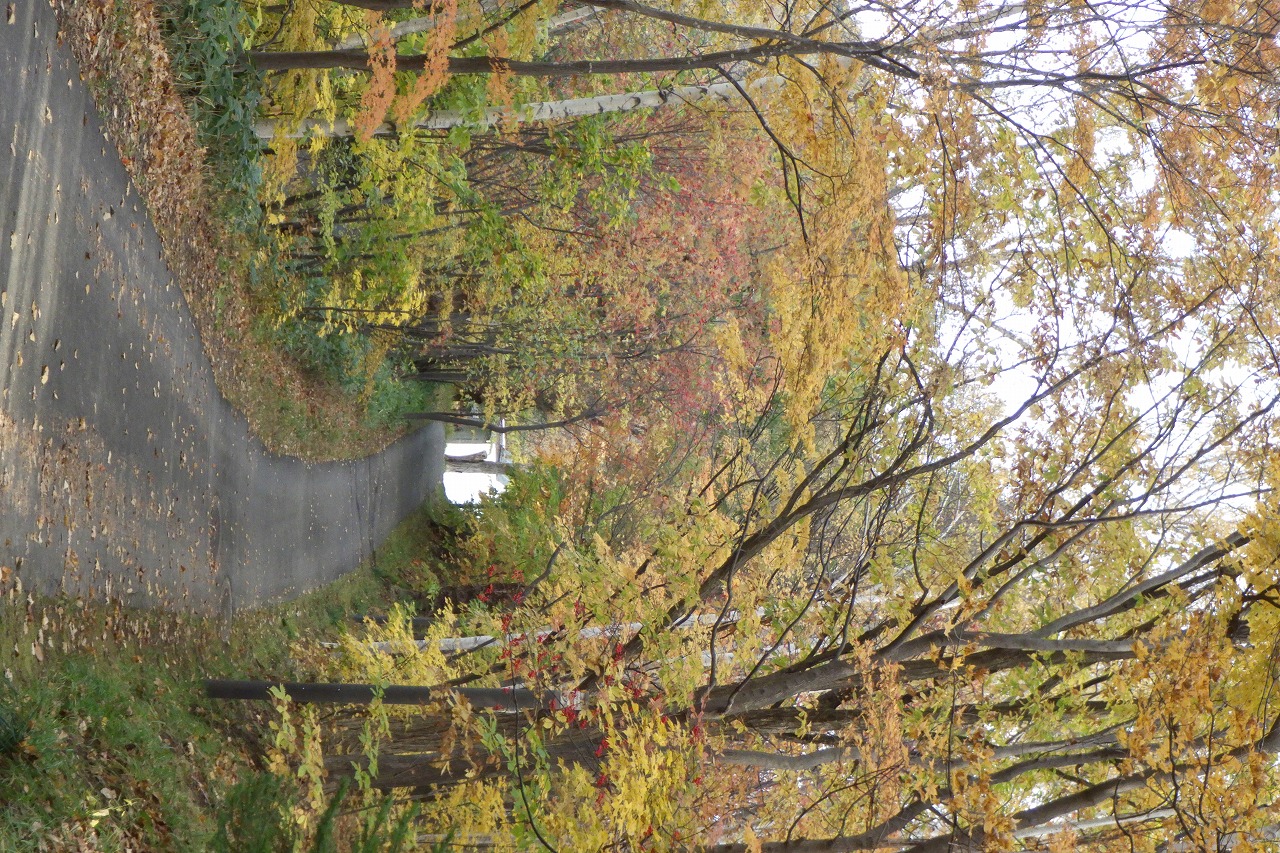 後の葉がまだ緑色の木はニセアカシア(ハリエンジュ)で、色づきが遅い樹種です。