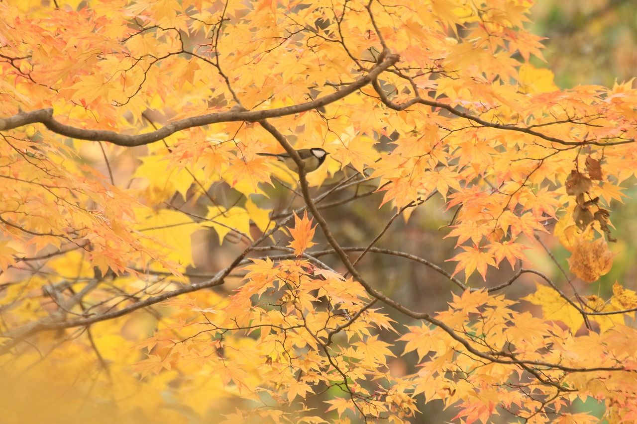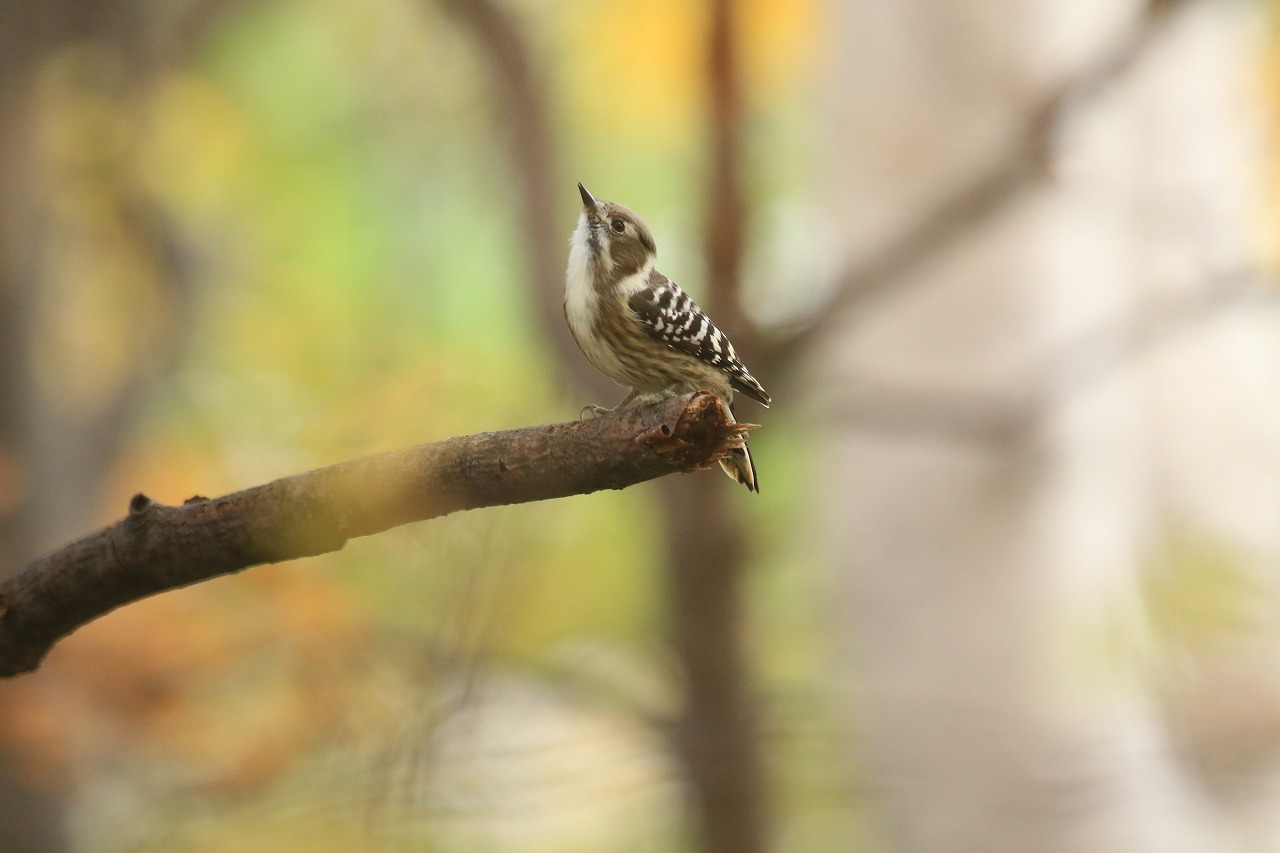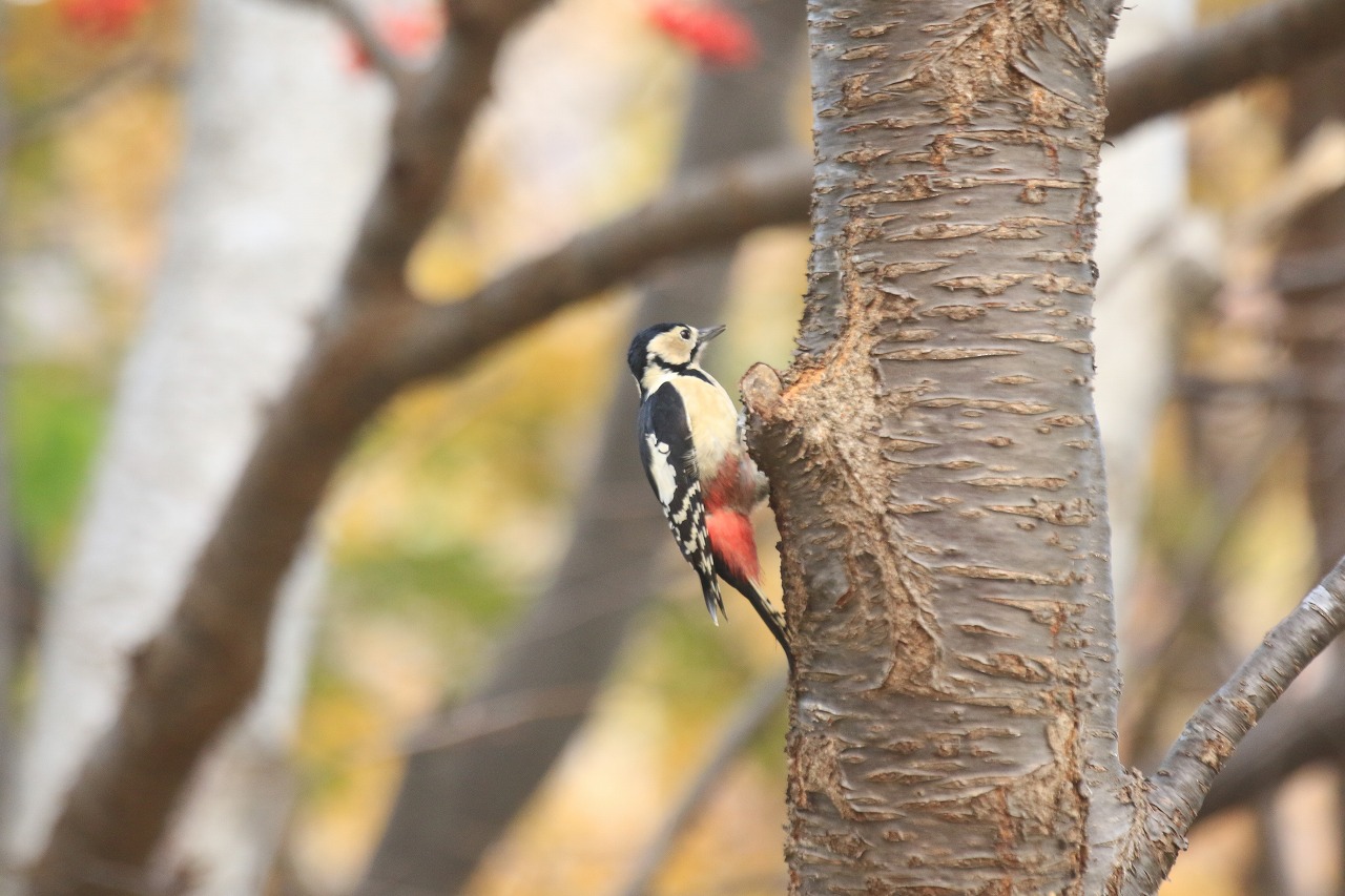 旭山記念公園は紅葉真っ盛りですが、アカゲラやオオアカゲラそれにコゲラは、周りの風景を入れて季節感を反映させた写真を撮りやすい野鳥です。
