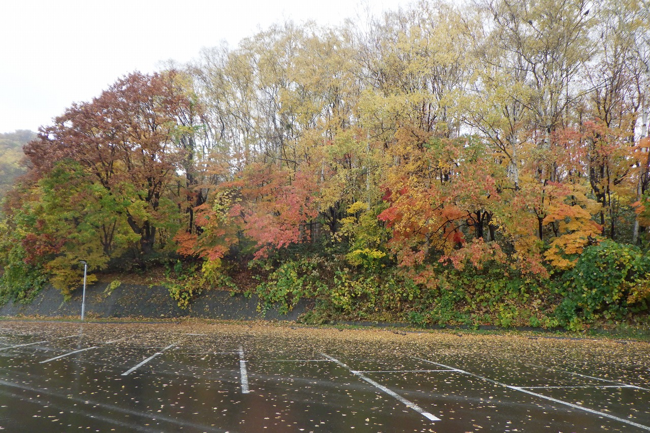 今朝は雨で車も人も少なく、第1駐車場西側斜面の紅葉も車がない状態で撮れました。