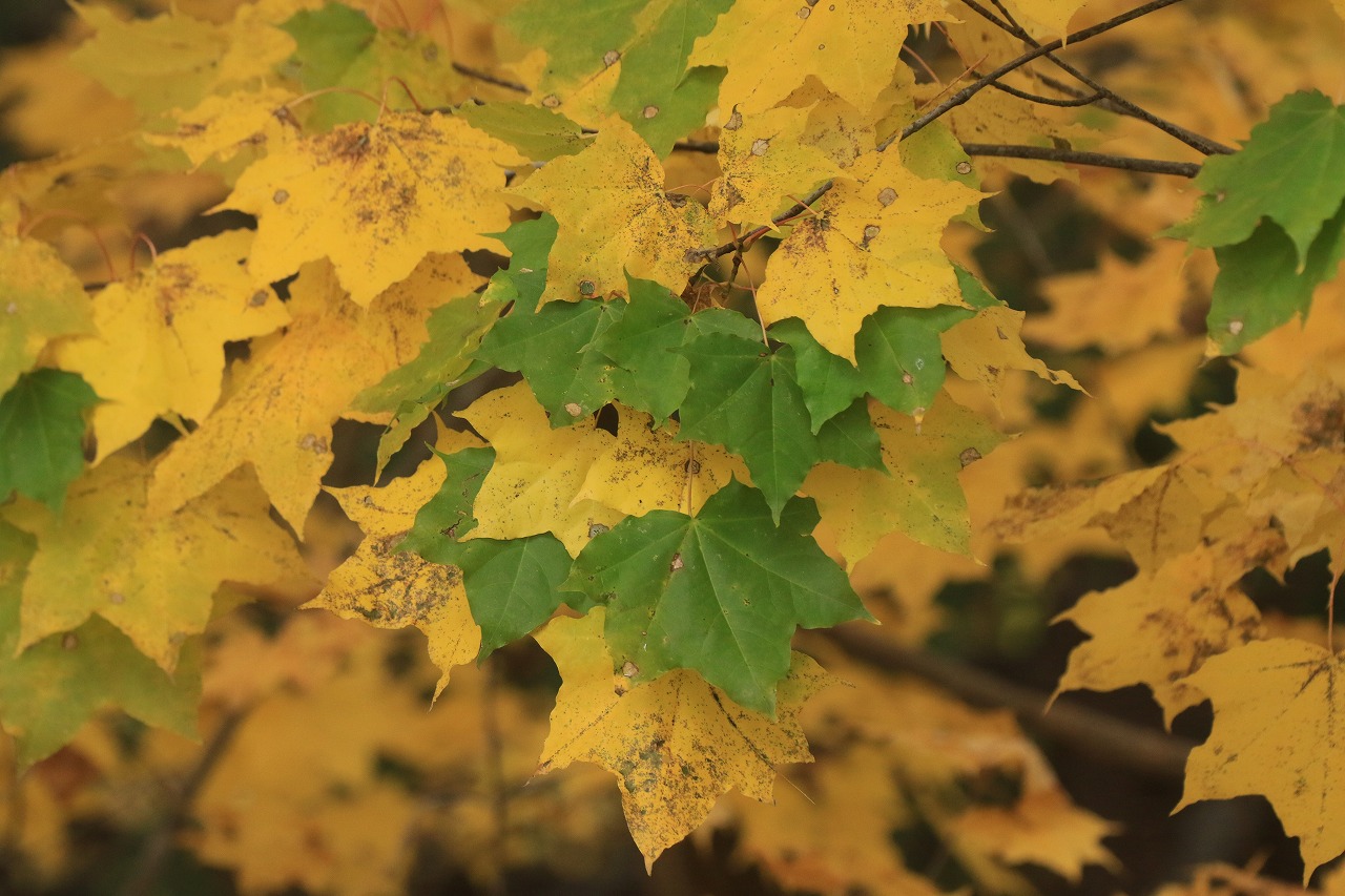 このアカイタヤ、同じ木のしかも同じ枝の中に黄色い葉とまだ緑の葉があります。
