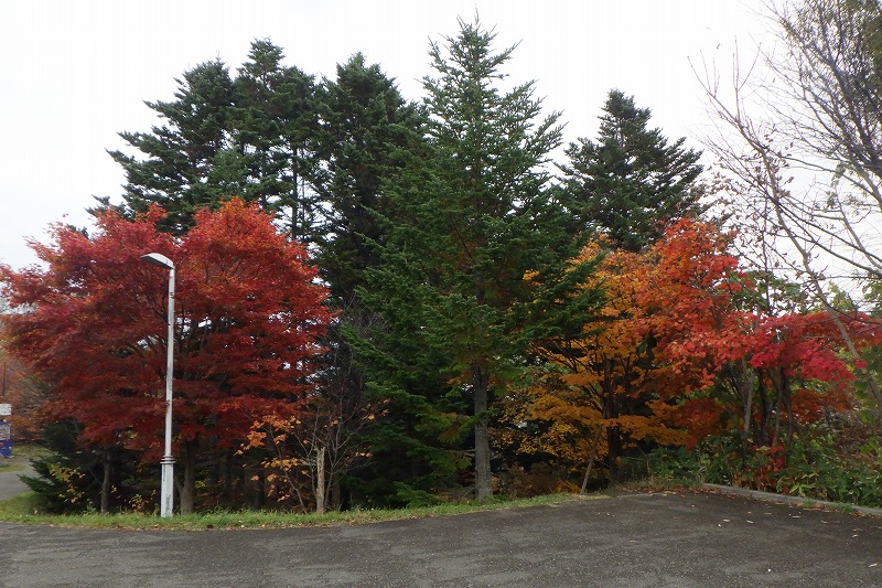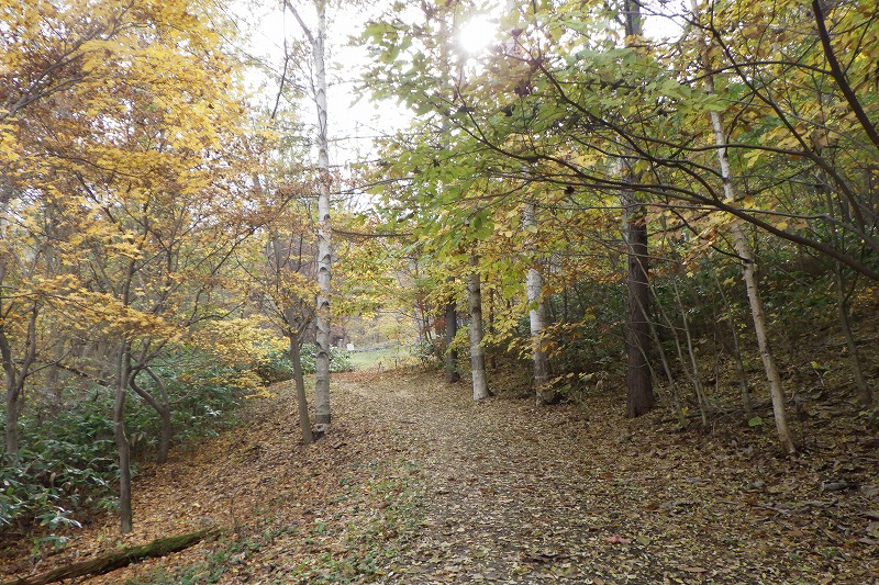 「ちびっこ広場」へ降りる道。針葉樹と紅葉にはさまれた入り口です。
