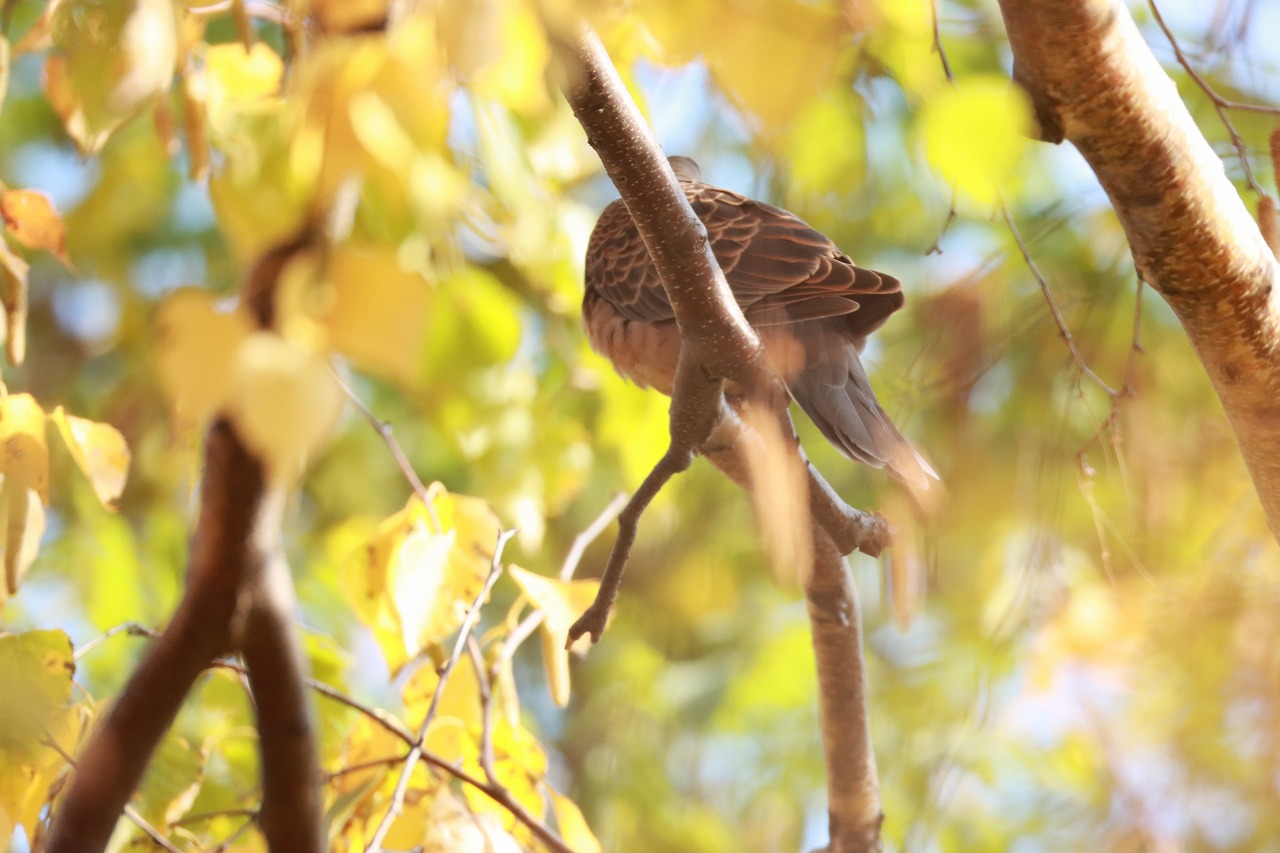 写真は10月29日に撮影したもので、かなりの枝被りですが、キジバトであることは分かるかと思います。