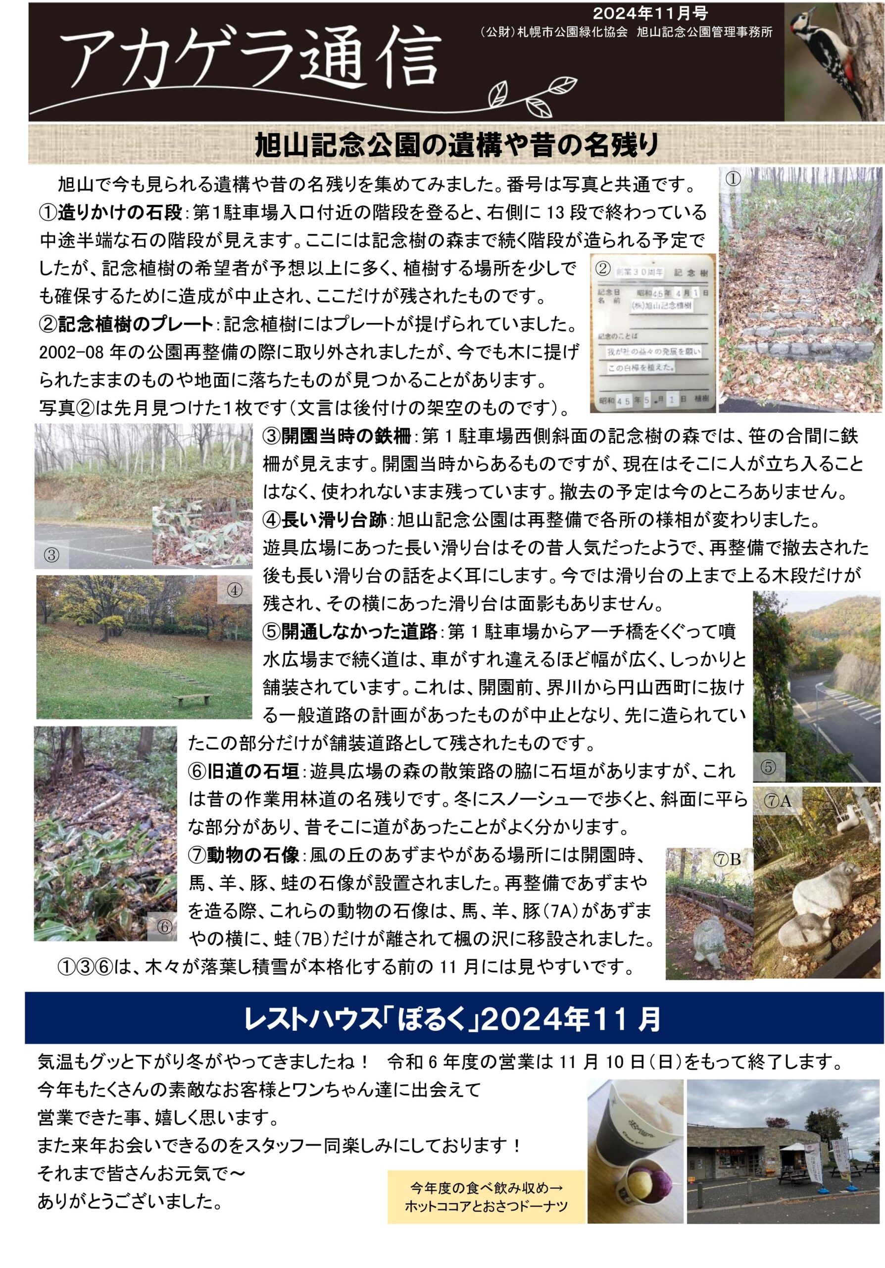今月の特集は「旭山記念公園の遺構や昔の名残り」と題し、造りかけの石の階段、開園当時の鉄の柵など、今でも見られる昔の名残りを写真付きで解説しています。
