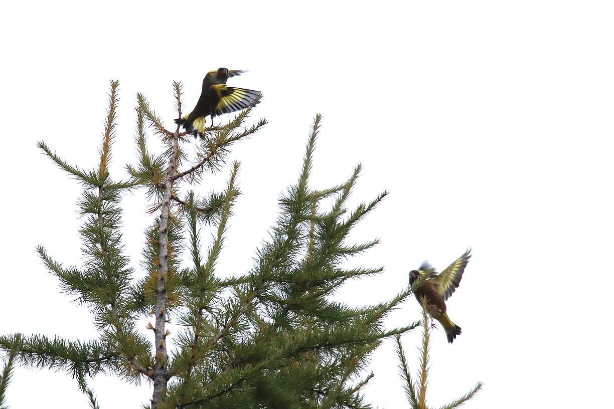 シメはいることはいるのですが、なんせ警戒心が強いので、なかなか近くでは見られず、たいてい飛んでいるかやや遠くの高い木にいるのを見るだけで終わります。
