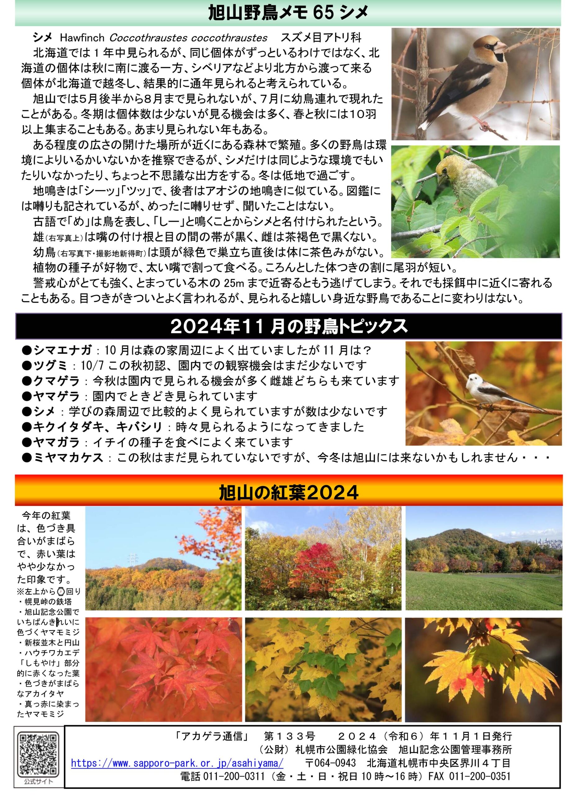 旭山記念公園野鳥情報、2024(令和6)年11月2日土曜日。