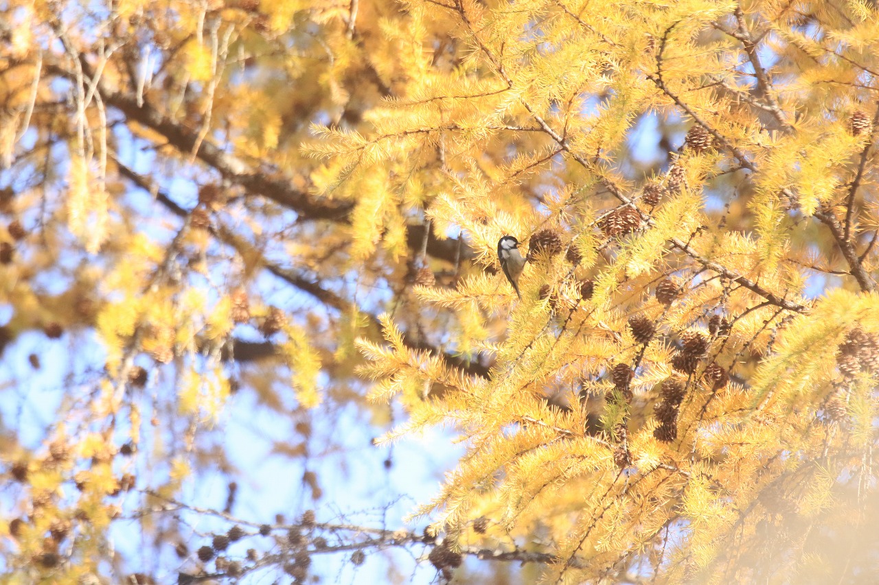 11月16日、カワラヒワ数羽が「カラマツ林」のカラマツで採餌していました。