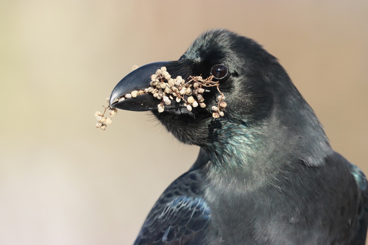 写真はヌルデの果実をくわえて飛んで来てとまったところのものです。