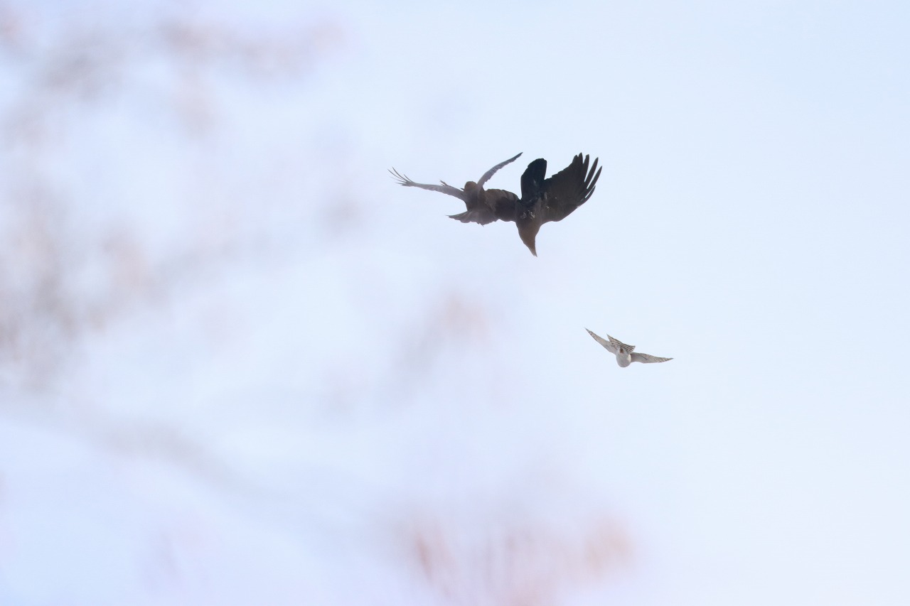 11月25日(月)、「噴水広場」上空に雌と思われる1羽が現れ、ハシブトガラス数羽にモビング(追い回されること)されていました。