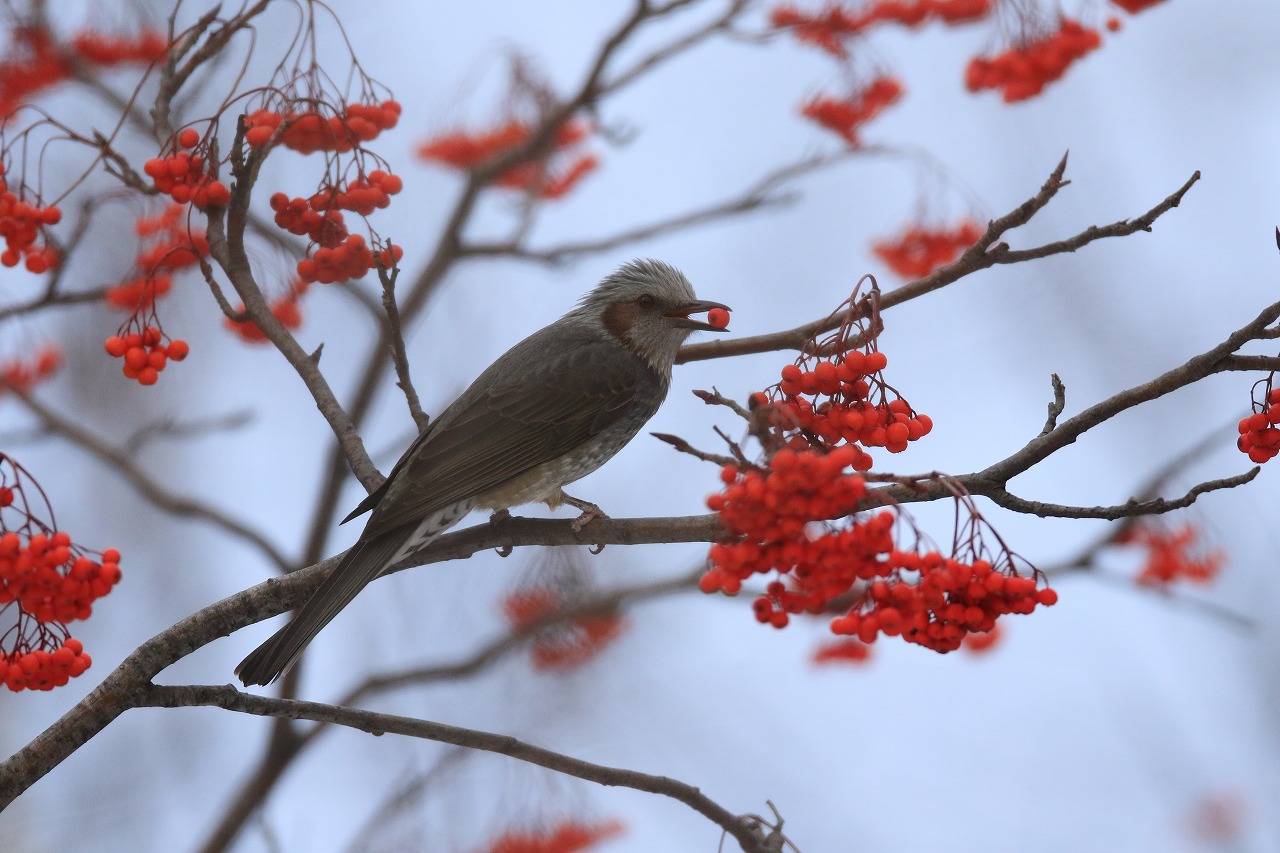 「噴水広場下斜面」のナナカマドの周りにこのところツグミが集まっていて多いときには10羽以上が見られていますが、その中に1羽だけいました。