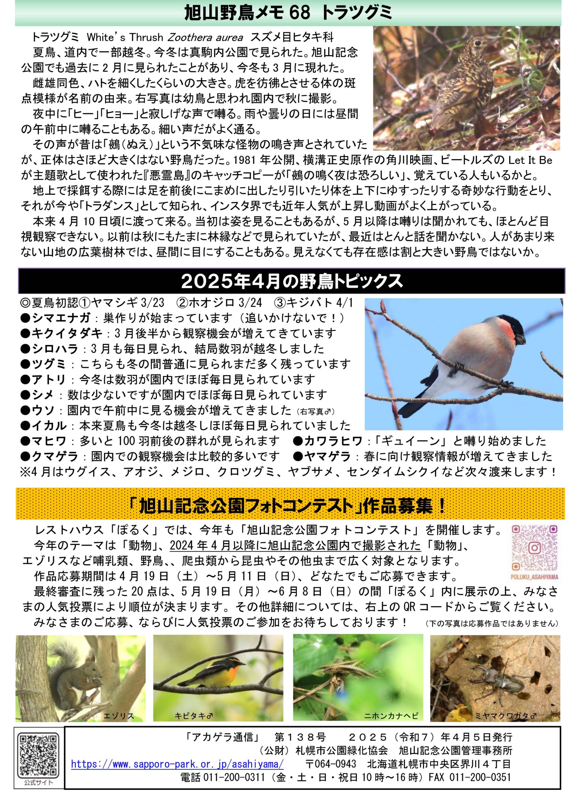 旭山記念公園野鳥情報、2025(令和7)年4月6日日曜日。