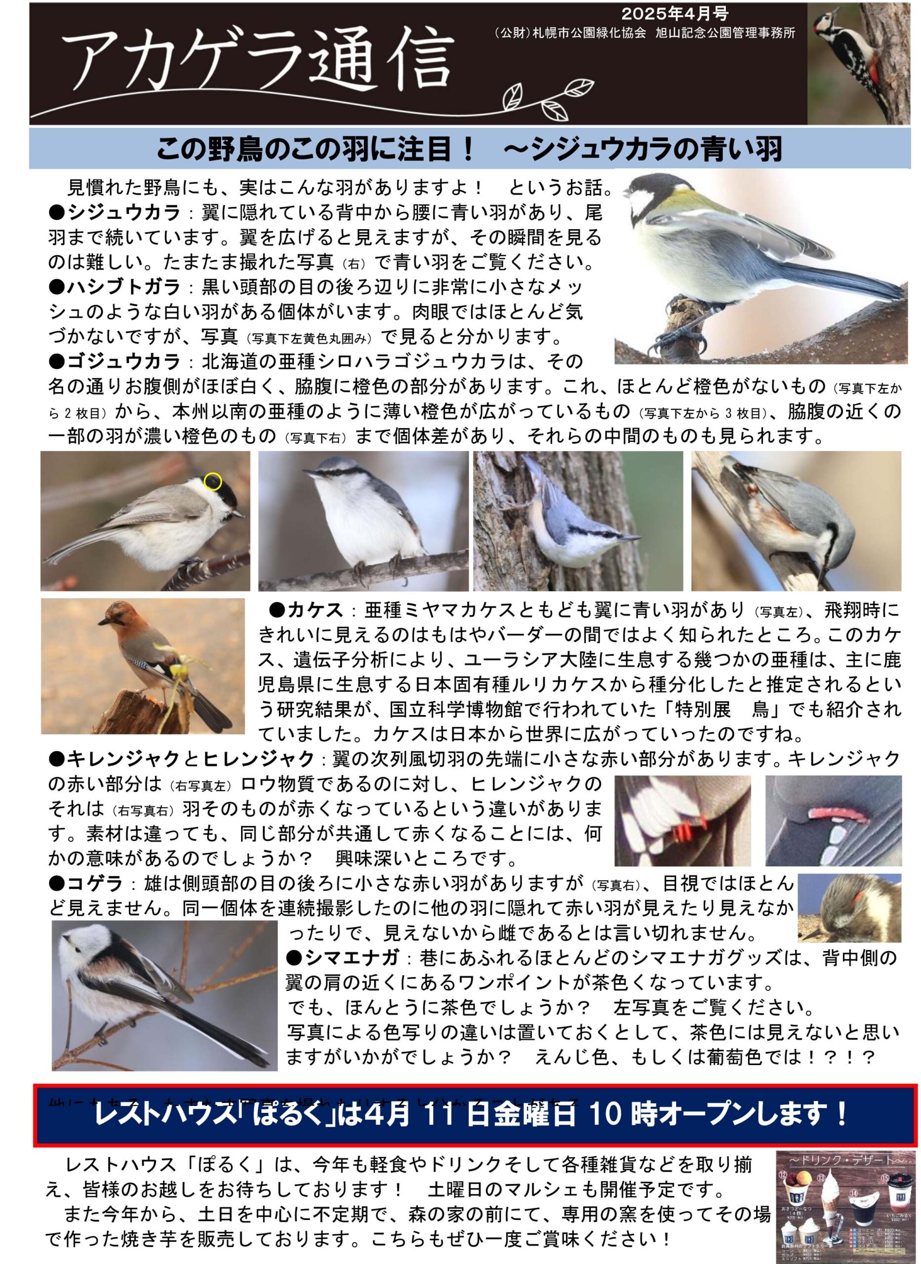 今月の「アカゲラ通信4月号」は、シジュウカラの腰の青い羽を取り上げていますが、「アカゲラ通信」はこの記事の後半をご覧ください。