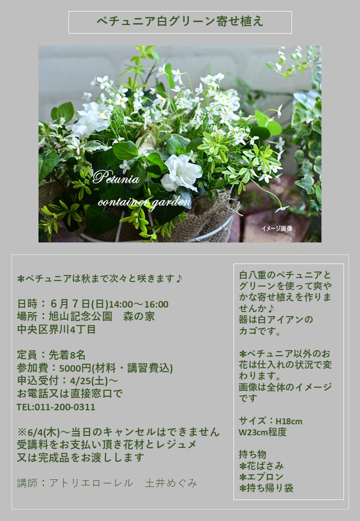 2026年6月7日に開催する、園芸講習会「ペチュニア白グリーン寄せ植え講座」についてご案内いたします。