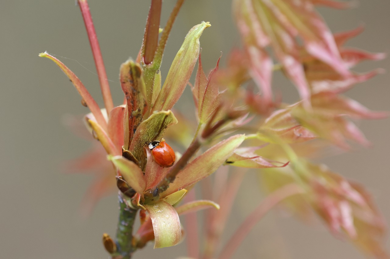 普通のテントウムシはナミテントウともいわれますが、模様の変異が大きく、この写真は「無紋型」とよばれるタイプです。