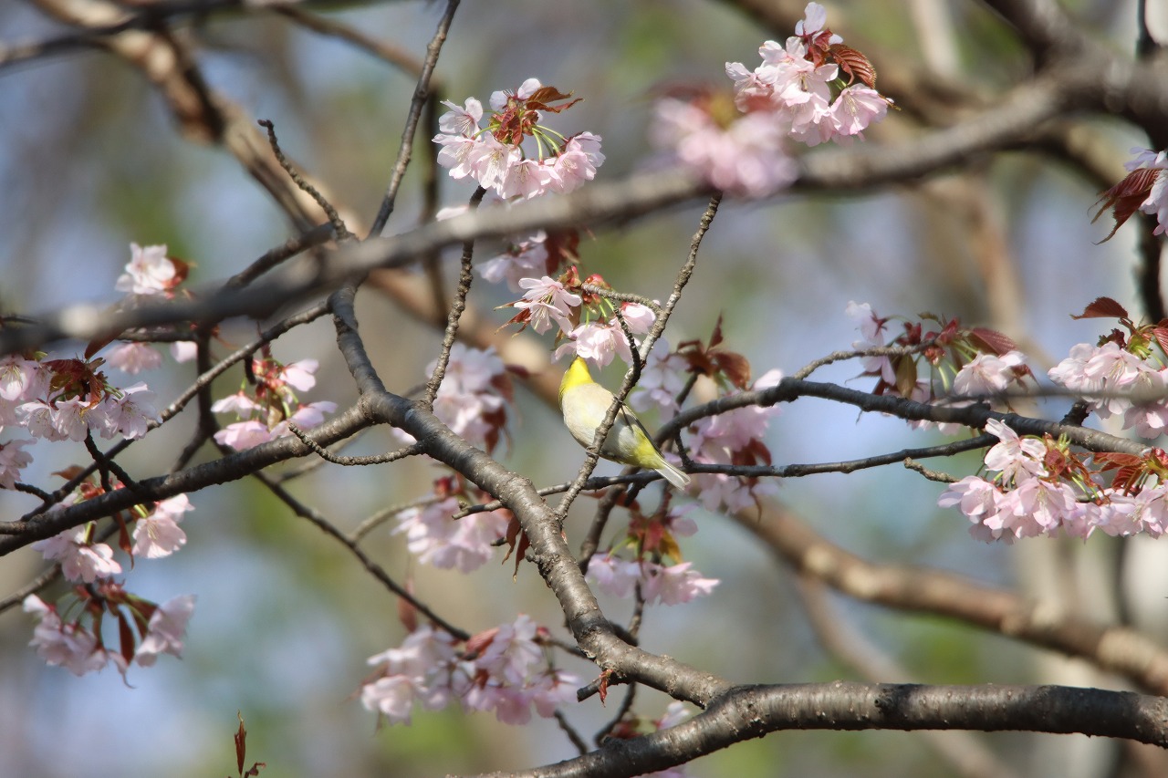 桜の上の黄色いのは、先週取り上げたイタヤカエデの花です。
