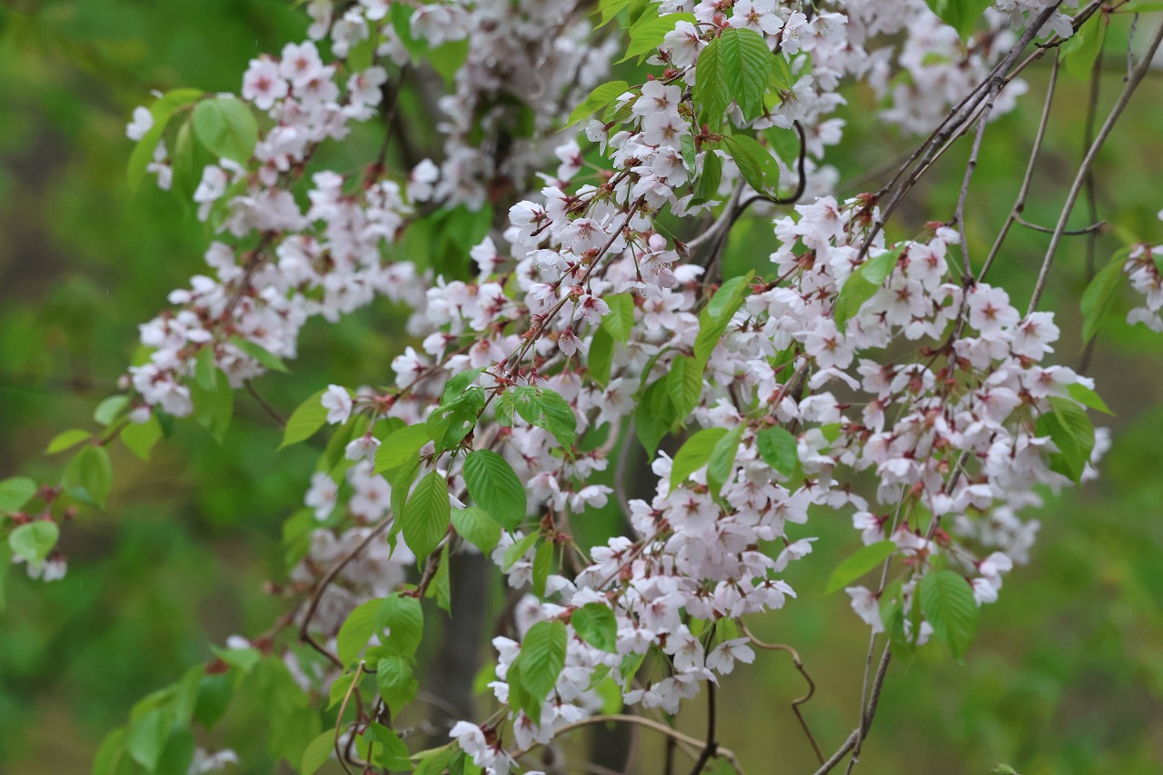 エゾヤマザクラが散り、白い花が咲くカスミザクラが園内何か所かでほぼ満開になっています。