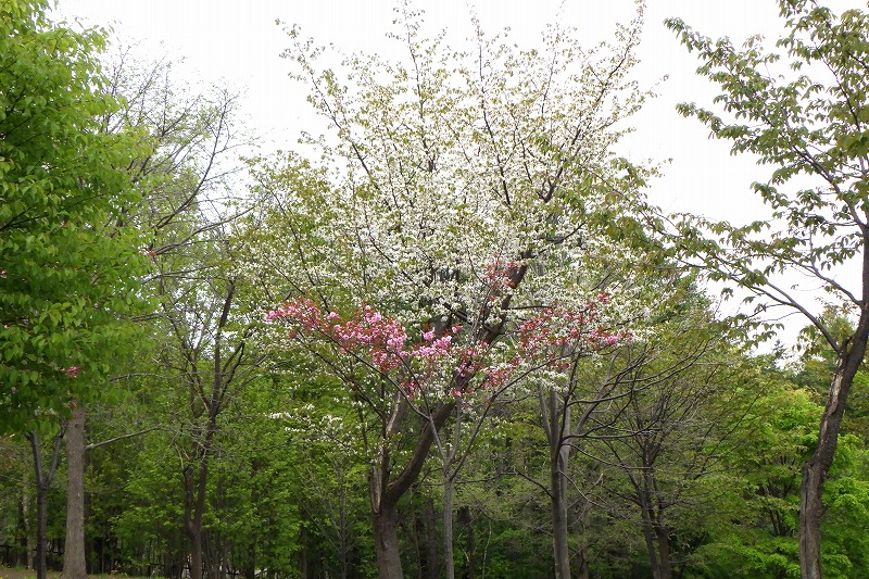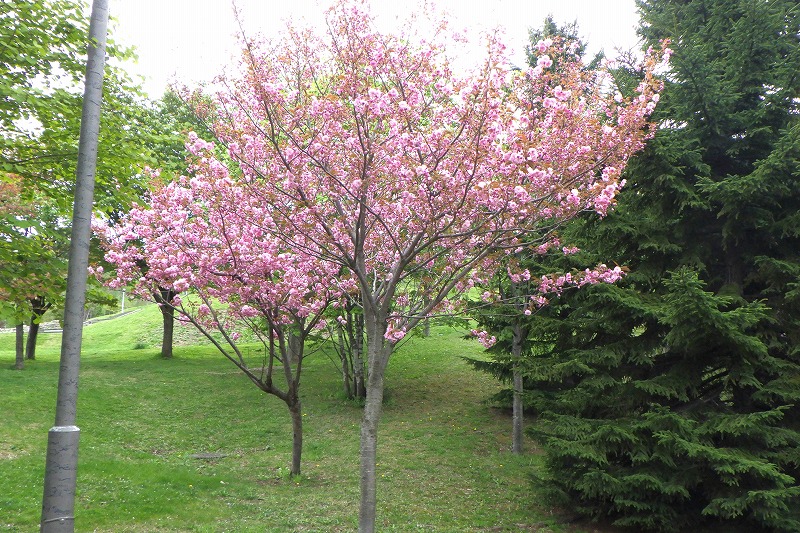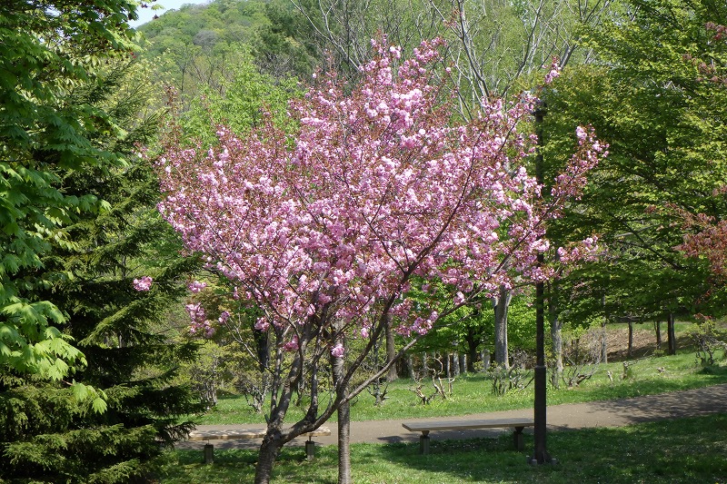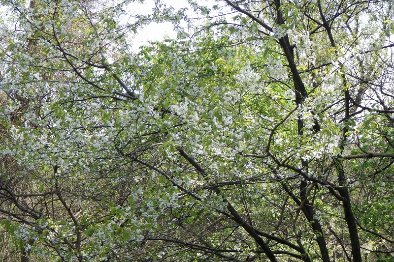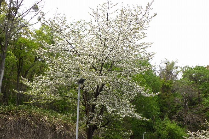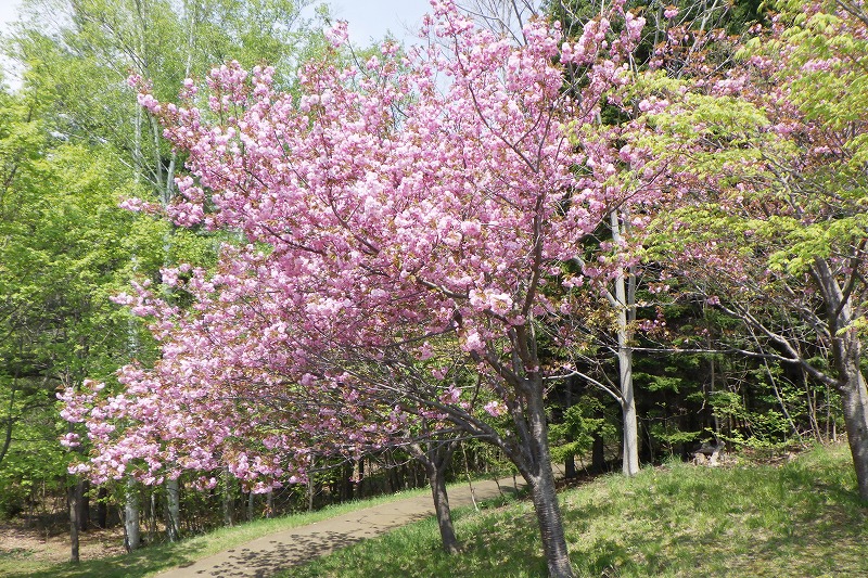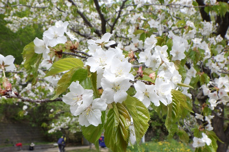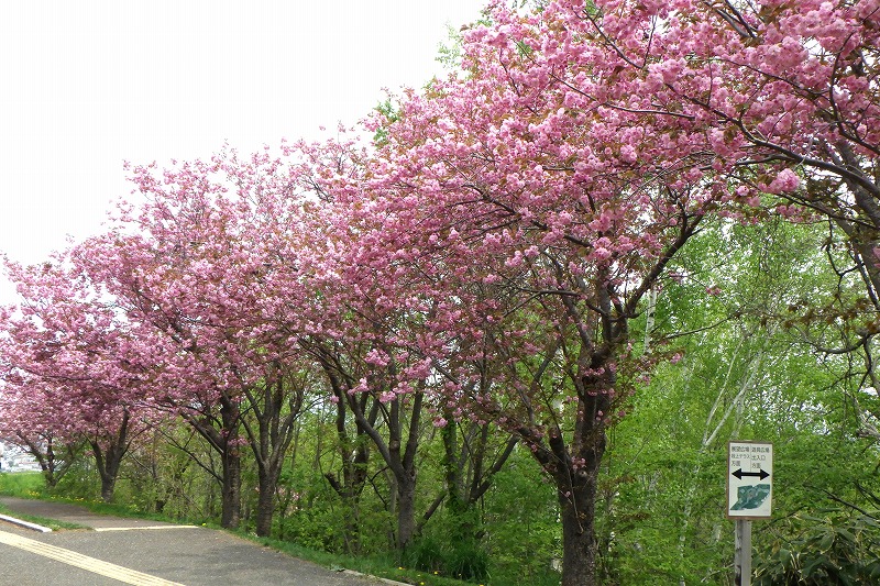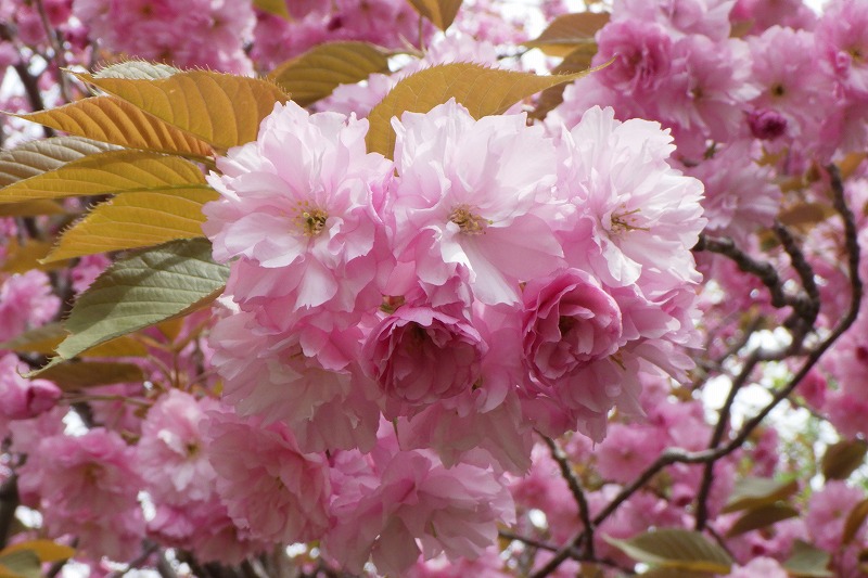 新桜並木の満開のカスミザクラと八重ザクラ。