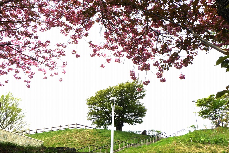 満開の八重ザクラの花と新緑の展望台の一本桜。