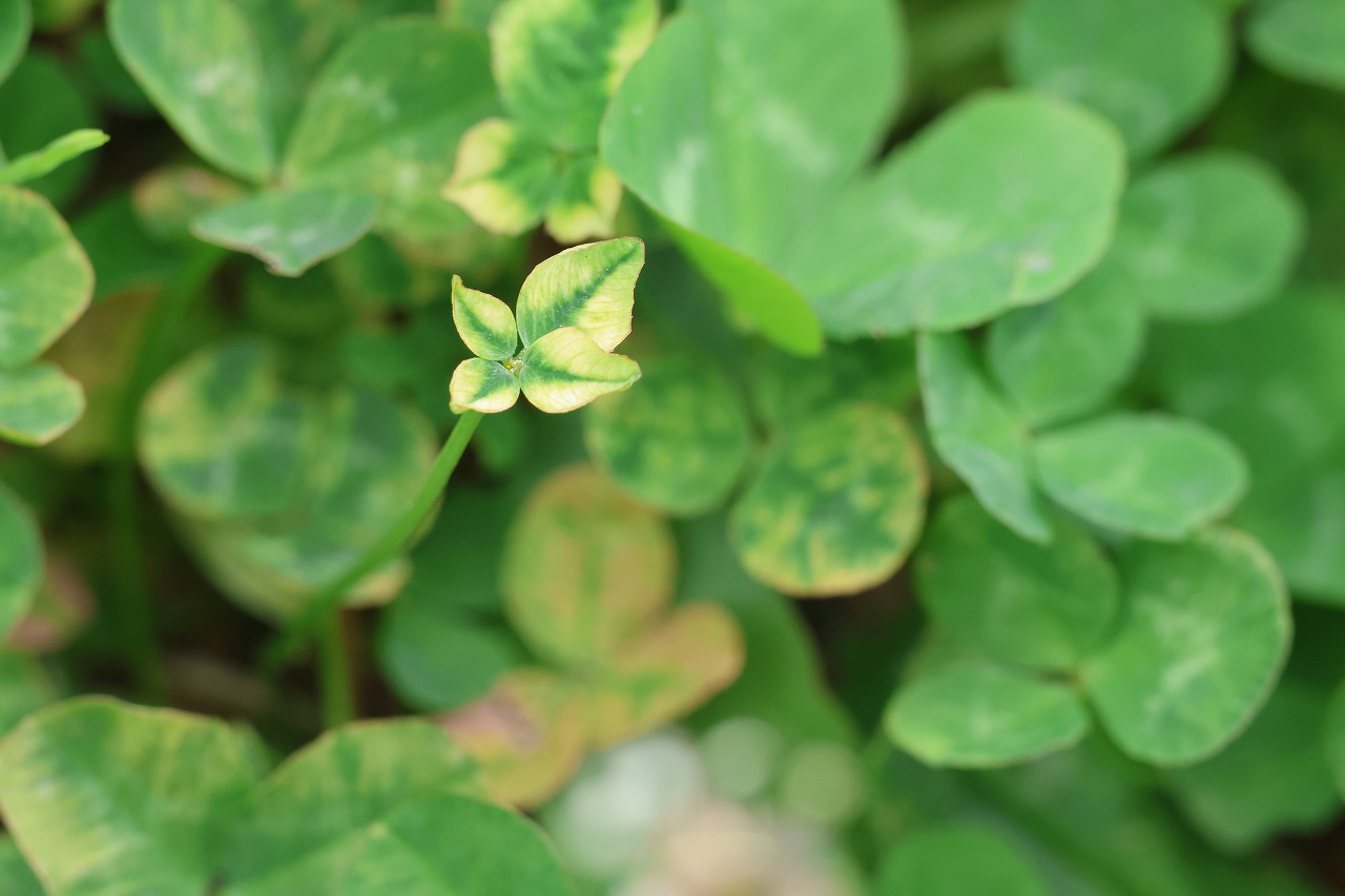 「噴水広場」の芝生に斑入りのシロツメクサがあり、その小群落の中に、葉は小さいですが四つ葉のクローバーがありました。
