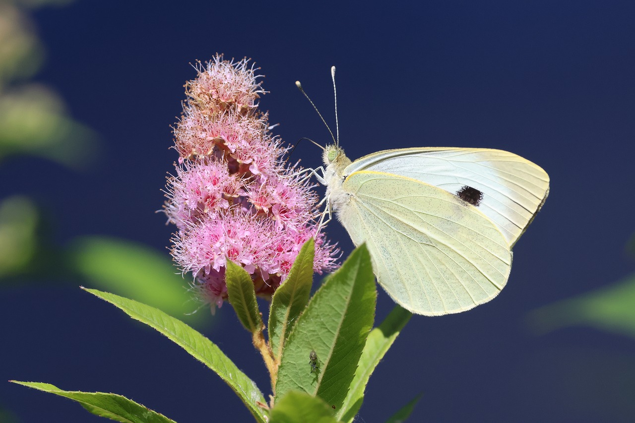 モンシロチョウやスジグロシロチョウの仲間より少し大きく、写真では透けて見えるだけで見えにくいですが、前翅表の端にある黒い部分がブーメラン型に見えるのが特徴です。