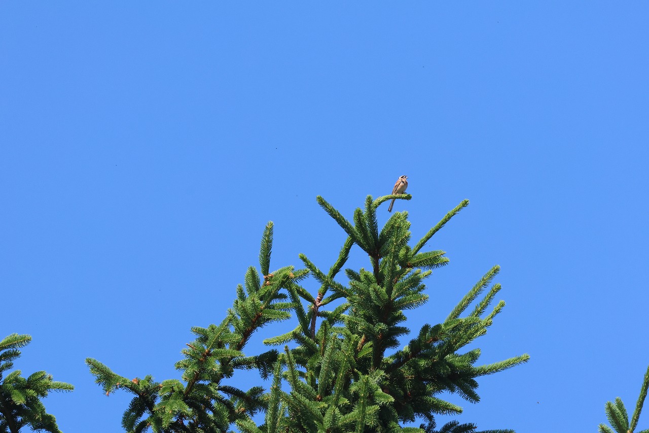 写真は「展望台松林」の木のてっぺんで囀る雄で、ここはお気に入りの場所のようで姿がよく見られますが、遠いので撮影できてもこんな感じの写真になります(ノートリミングです)。