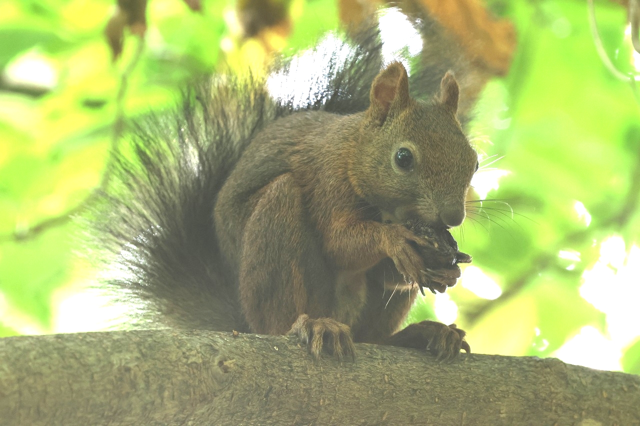 まだ外側が緑色のオニグルミの実をくわえて走る姿も見られることがあります。