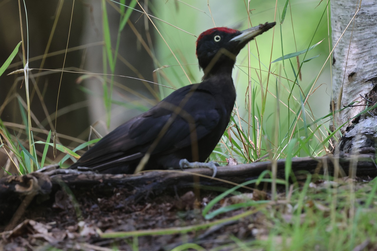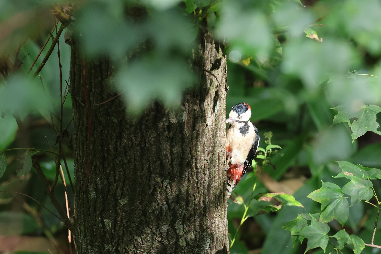 「キョッ」と鳴いたり鳴かなかったりで、近くにいても気づかないことがあると思われますが、森の中では木をつついたり何かが笹の上に落ちる小さな音に注意してみてください(アカゲラだけに限らずですが)。