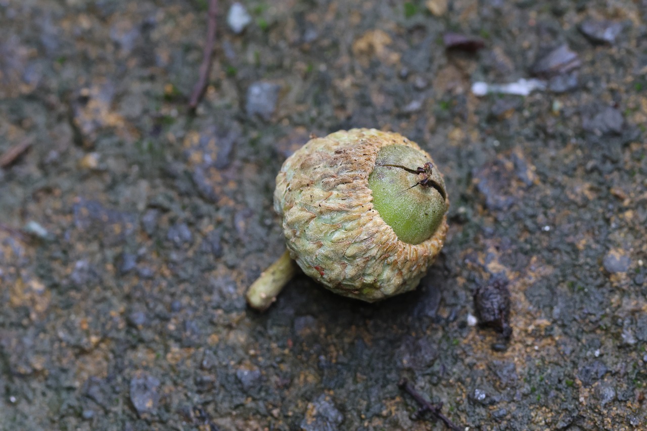 昨年豊作だったミズナラのどんぐり、今年は不作、凶作になるだろうと予想していましたが、予想通りになるのか、なりかけで落ちたどんぐり(果実)を見つけました。