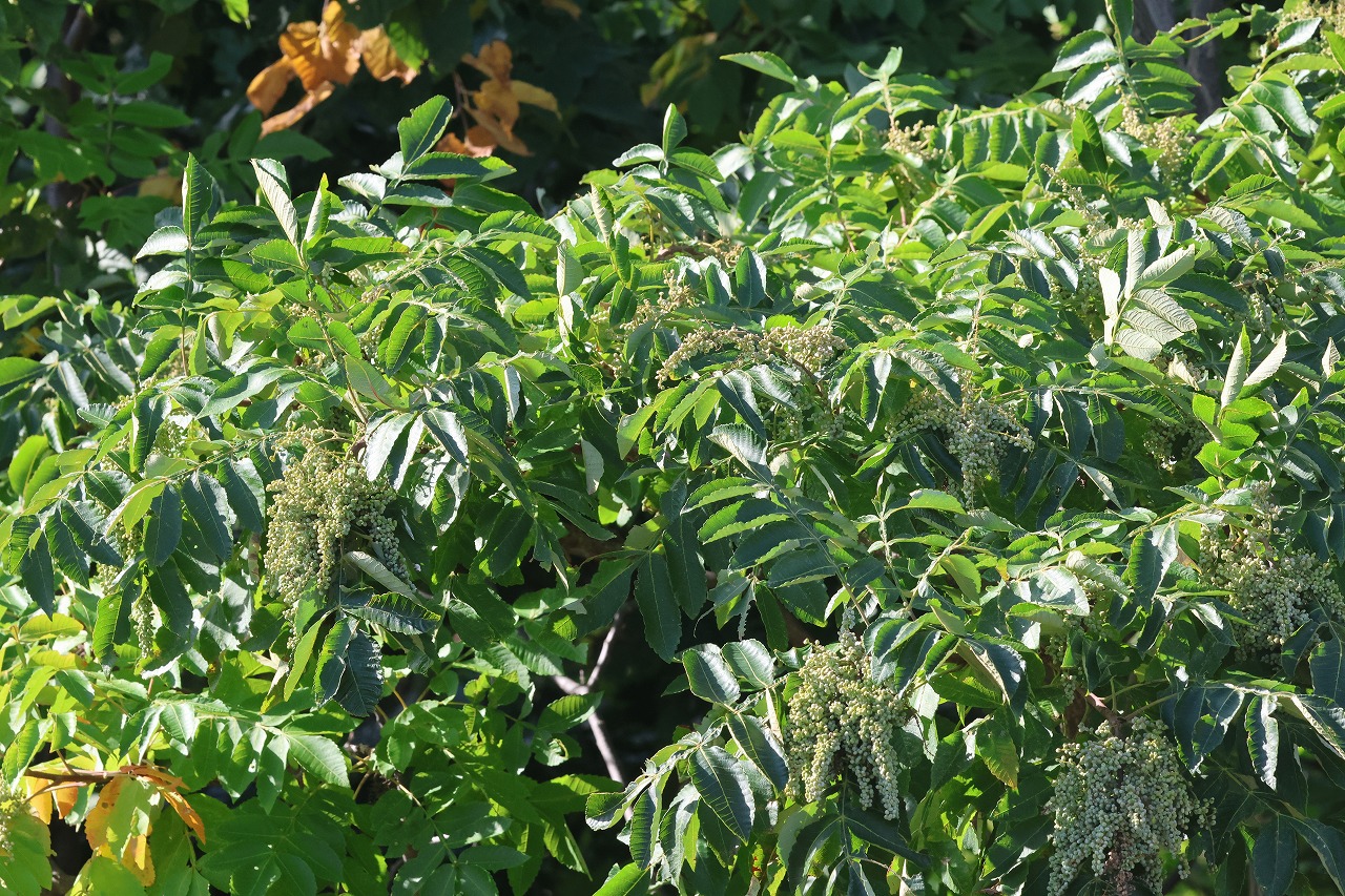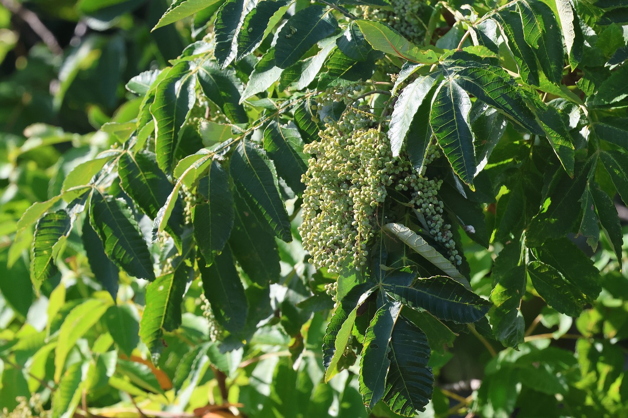 ヌルデは果実に塩分が含まれていて、冬に茶色くなると野鳥の貴重な食糧となるのですが、今年はまだ緑で果実がなり始めた頃から早々に食べ始めています(写真4枚目と5枚目)。