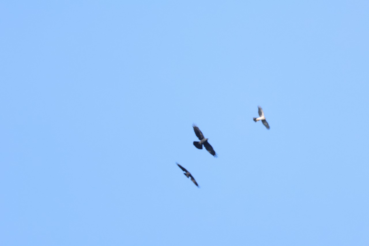通常はタカがカラスに追いかけられる(モビングされる)ものですが、今日はタカの方がカラスを執拗に追いかけていました(写真はカラスが追いかけているように見えますがたまたまそういう瞬間でした)。
