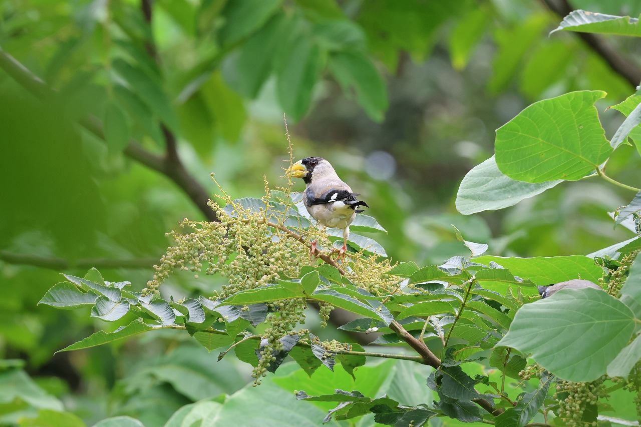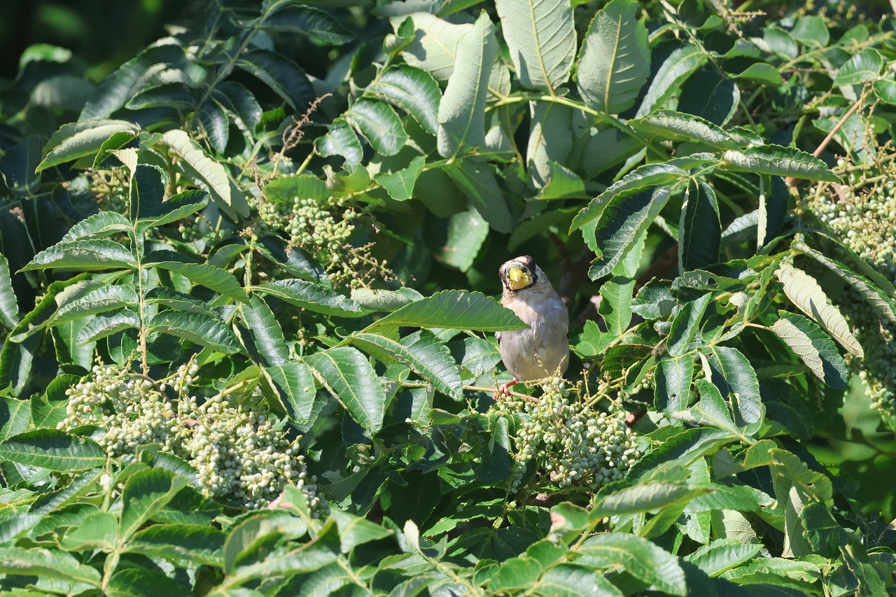 イカルも慣れたのか、今日は幼鳥1羽だけ園路を人が歩いて来ても逃げずに食べているといったこともありました(写真3枚目、9月15日撮影がその個体)。