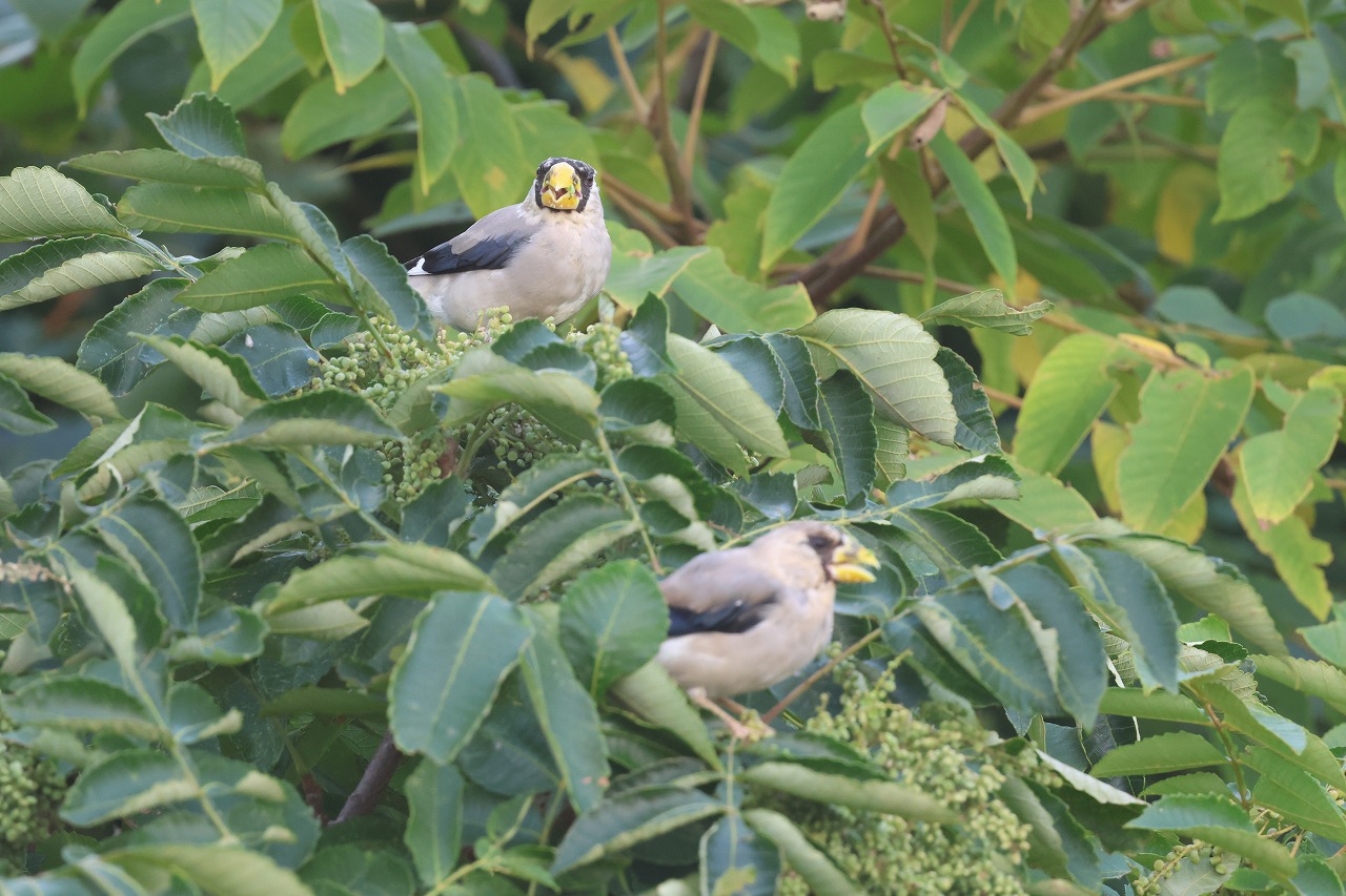 9月に入ってからそれ以前よりはイカルの声を聞く機会が増えていましたが、9月8日、「作業員詰所」付近のヌルデの木の果実を食べる姿が観察され、翌日から20~40羽の群れで見られるようになり、今日まで毎日見られ続けています。