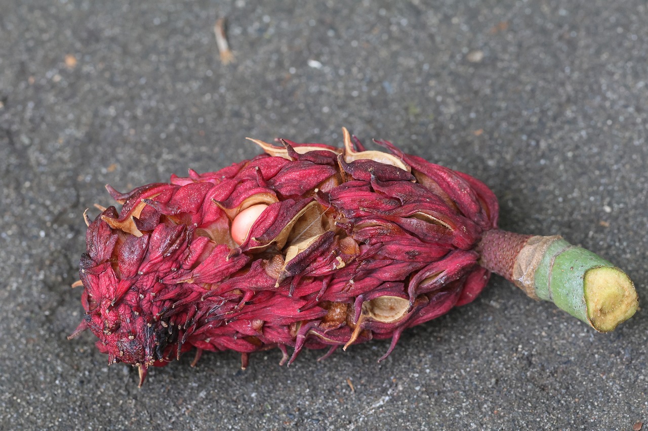 9月15日の記事では木についた状態のモクレン科ホオノキの果実を上げましたが、さらに赤くなり、地面に落ちていたものを見つけたのでまた上げます。