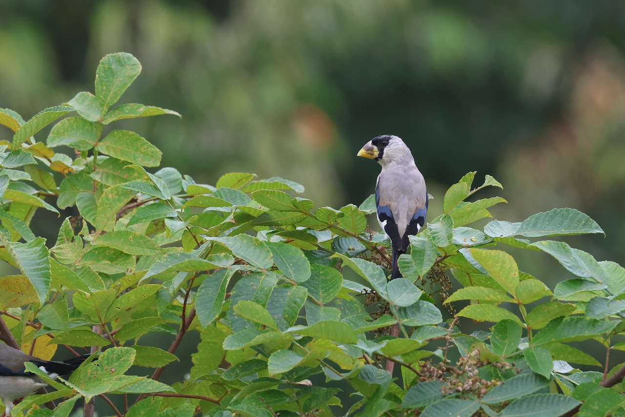 写真は9月29日に園内で撮影したヌルデ果実を食べる幼鳥ですが、この先のイカルの出方、市内どこで見られるかに要注目です。