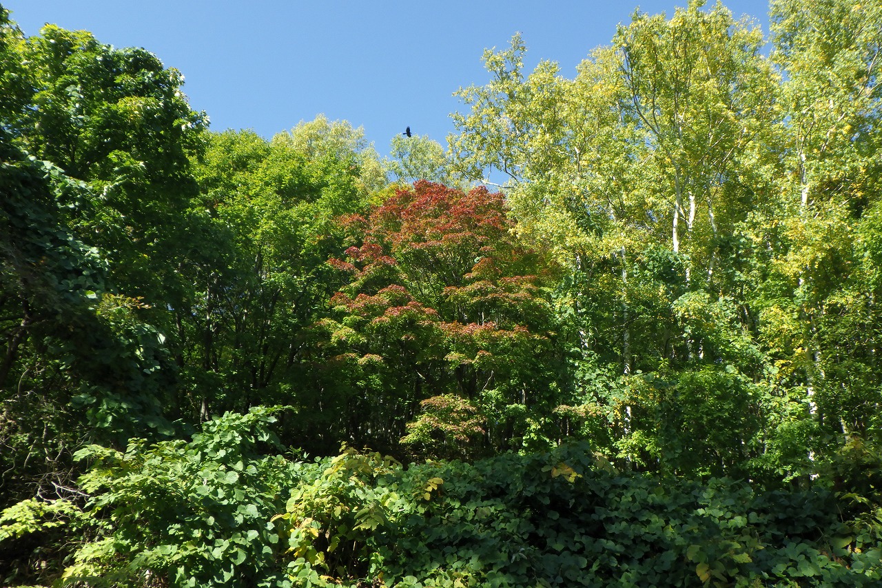 エゾヤマザクラも、木によってはもう落葉していたり、逆に緑色だったり。