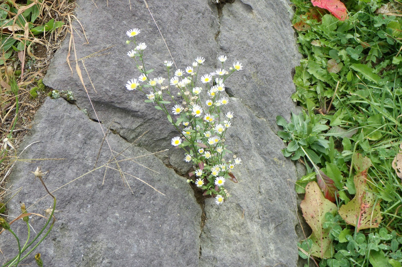 「八重桜並木」沿いの石垣から生えているヒメジョオン。