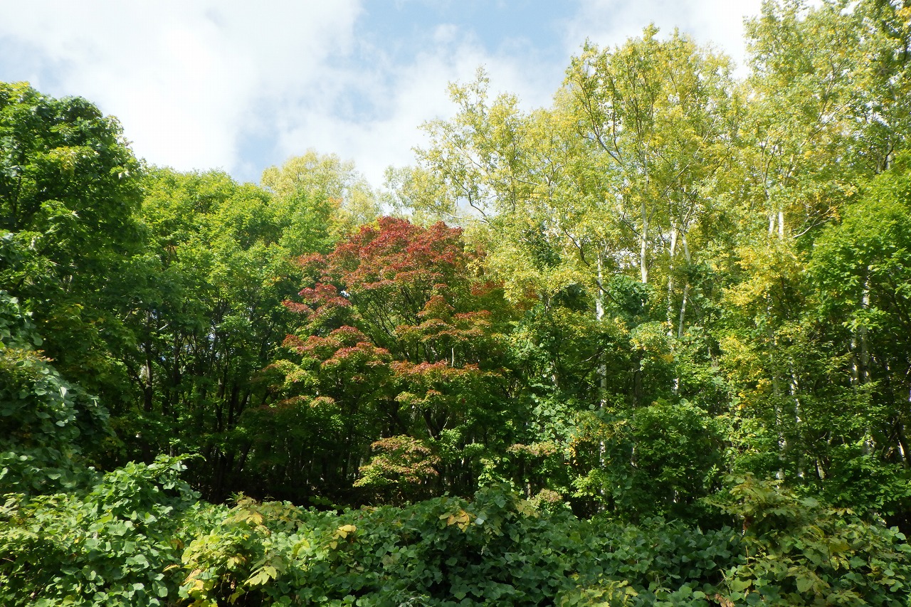 「旭山でいちばんきれいに色づくヤマモミジ」、周りのシラカンバの葉がだいぶ黄色くなってきました。