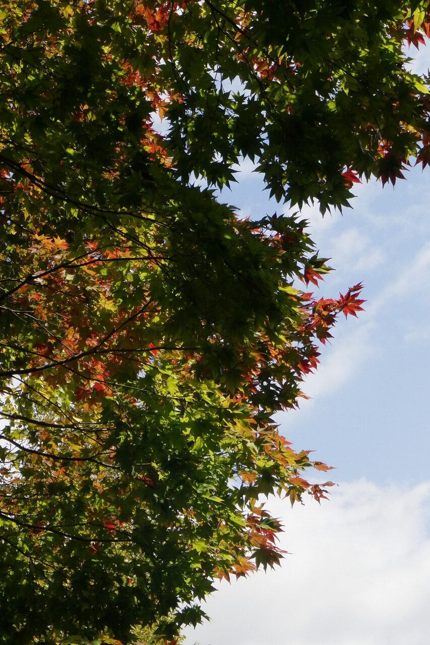 「旭山でいちばんきれいに色づくヤマモミジ」、木の下から撮りましたが、まだ色づきはまばらです。