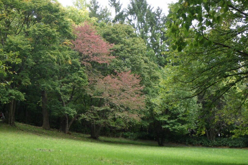 「寺田京子句碑」のヤマモミジとエゾヤマザクラは見頃が続いています。