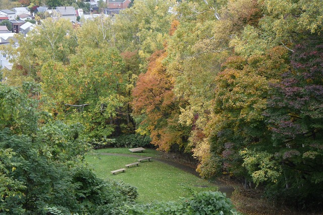 「遊具の広場」と藻岩山。藻岩山も色づいてきました。
