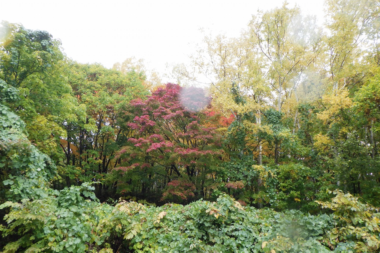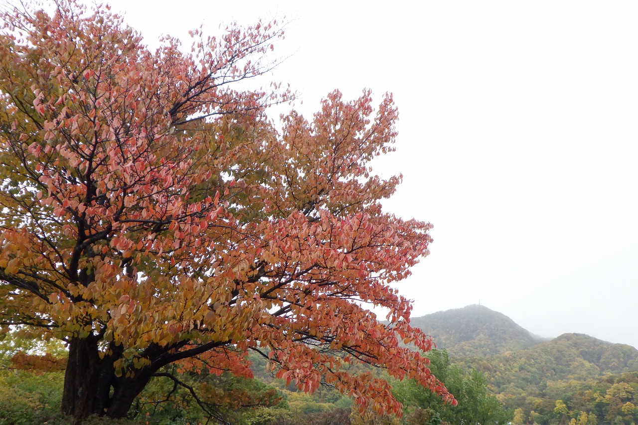 今年は桜=エゾヤマザクラの葉が落ちるのが遅く、この木もまだたくさん赤い葉をつけています。