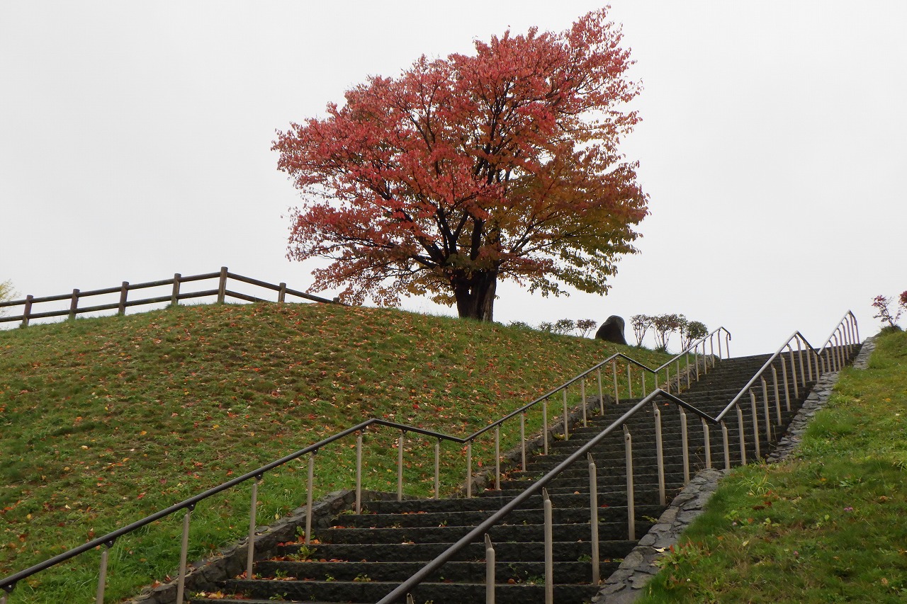 桜の赤い葉を見上げながら登る「展望台階段」。