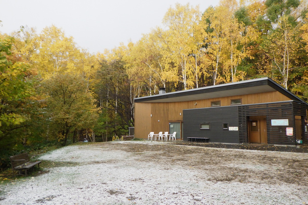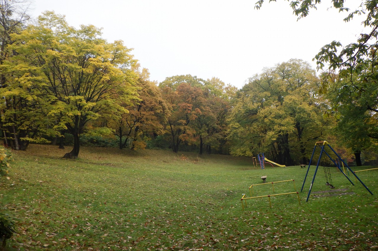 「遊具広場」、左のイタヤカエデの葉もだいぶ黄色くなってきました。