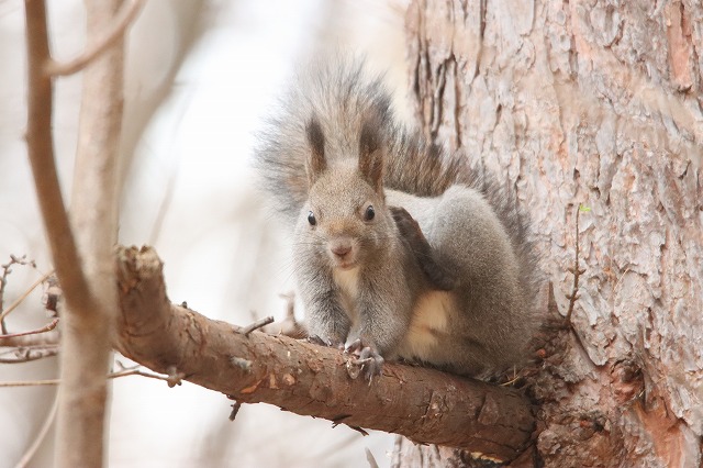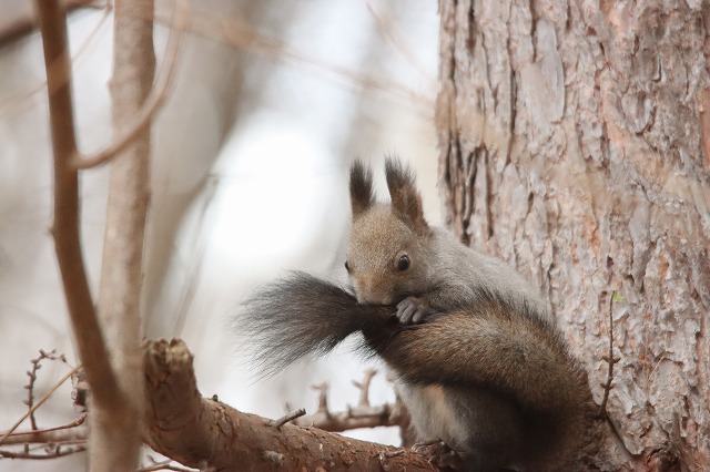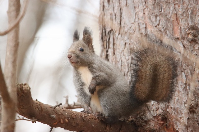 先週、雪が積もって地面で採餌できなくなった影響か少ないです、と書きましたが、雪が解けるとやはり、何事もなかったかのように普通に芝生などで採餌する姿が見られ、「クルミ落とし」行動もまた見られるようになりました。