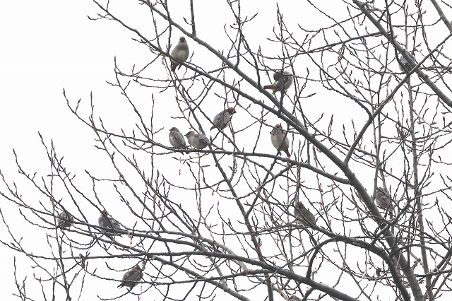 11月14日金曜日8時過ぎ、「旭山でいちばん高いドロノキ」に20羽がとまって「ヒーヒー」と鳴いているのを見つけ、中にキレンジャクも2羽混じっていました。