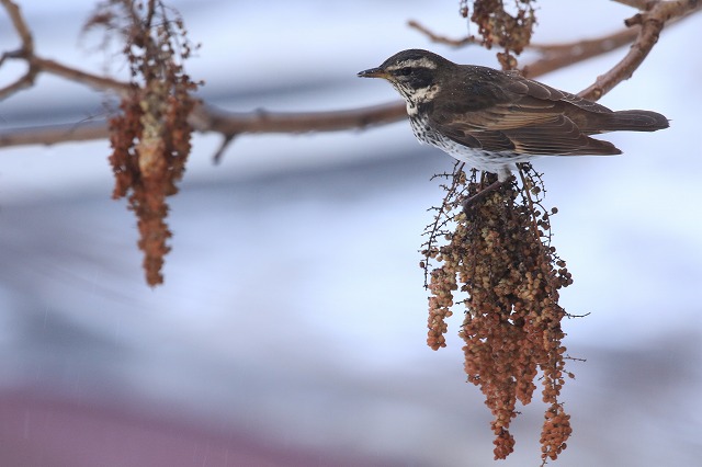 ツグミはここ3週間ほど、たまに確認できたり、住宅街で1羽2羽といった感じでしたが、今回は近くで見ることができ、そのうち2羽は「展望台ユニバーサル園路」沿いのまだ残っているヌルデの実を食べていました。