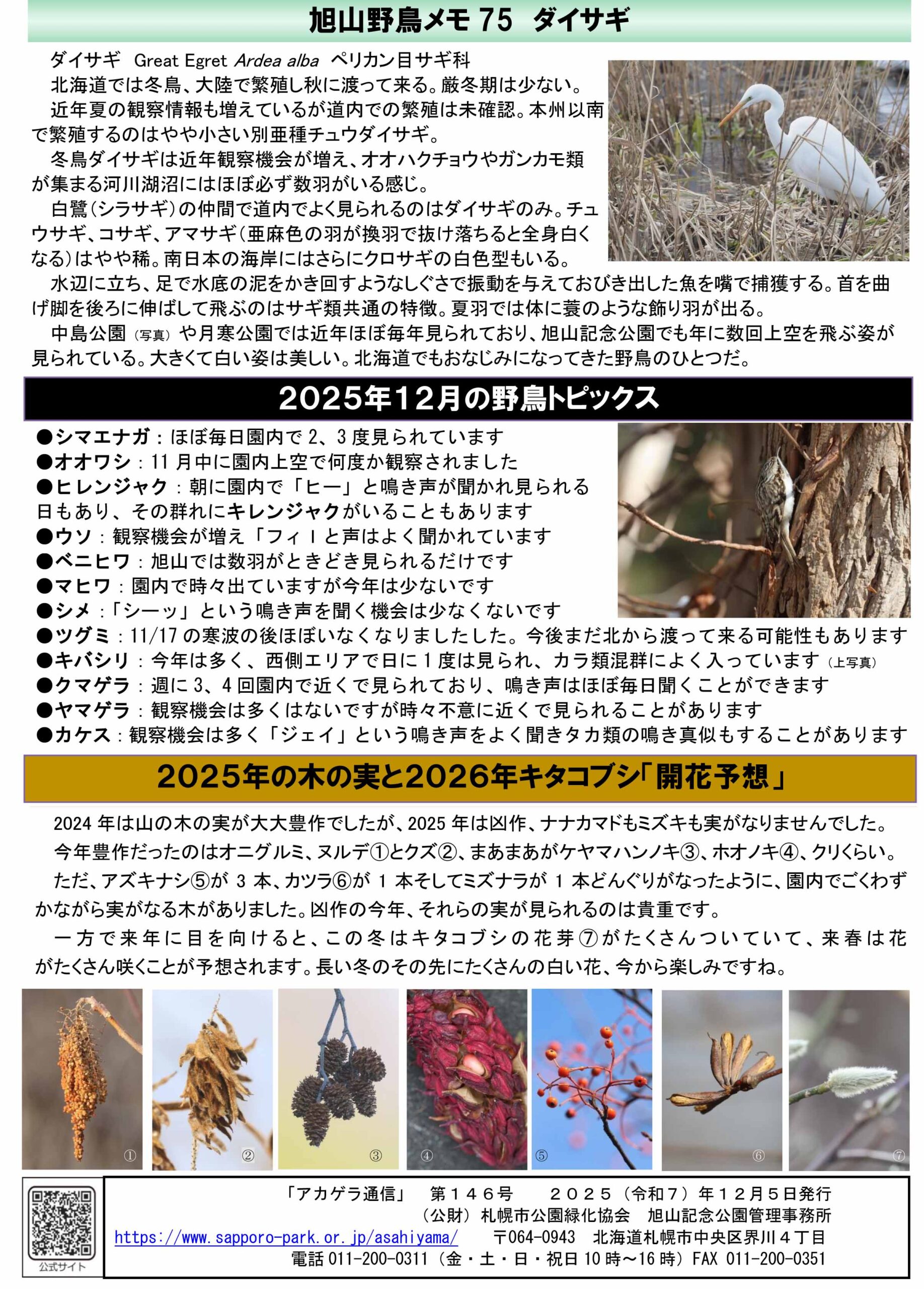 裏面「旭山野鳥メモ」はダイサギ(園内上空通過の観察記録あります)、「2025年の木の実と2026年キタコブシ「開花予想」」の特集です。