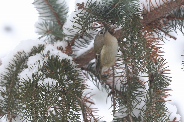 キクイタダキは松の中で「ツーツツー」などと低い声で鳴きますが、声が小さく、歩いている足音で聞こえないことがあるため、松の前に来た時には一度とまって鳴き声が聞こえないかチェックすると見られる可能性が高くなります。