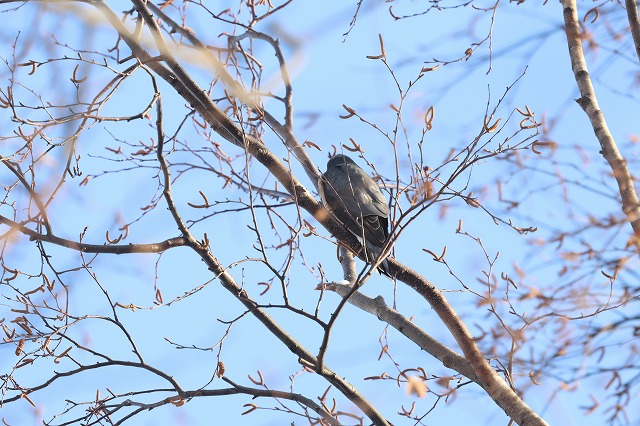 1月18日、「ミュンヘンの森」にいたコゲラなどがいつもと違う甲高い声で鳴いたので見ると、森の上にハイタカが飛んで来て、「記念樹の森」のシラカンバにとまったのが見えました。